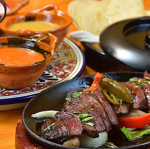 スカートまたはフランクステーキをライムやチリでマリネし、ピーマン・玉ねぎとともに熱々の鉄板でジューシーに焼き上げ。柔らかな肉と甘みある野菜のコントラストが抜群です。セルフでトルティーヤに包み、サルサやアボカドと一緒に楽しむ本格メキシコ料理です。