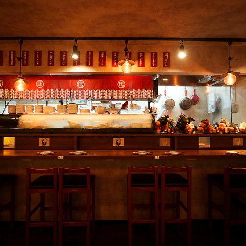 【お洒落なカウンター席】お一人様はもちろん、デートにもオススメのお洒落でスタイリッシュなカウンター席をご用意しております!木の温もりを感じる落ち着いた雰囲気の中、ごゆっくり馬刺しや馬肉料理をお楽しみください。