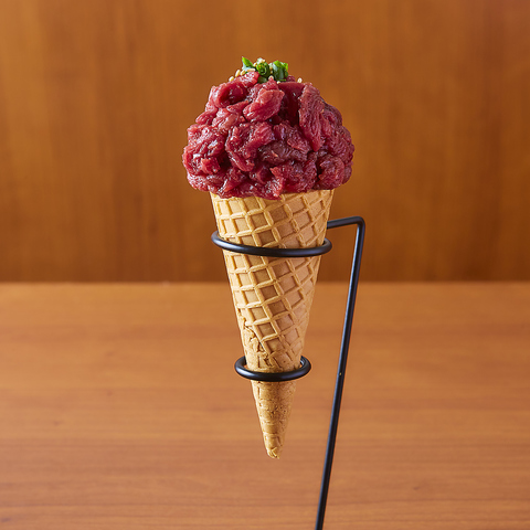 アイスクリーム風の見た目に圧巻!当店の一押しは、味付けた馬肉に卵を絡めて味わうユッケ!自家製味噌を混ぜた甘じょっぱい味わいは癖になること間違いなし!コーンを割り卵黄と共に混ぜてお召し上がりくださいませ♪