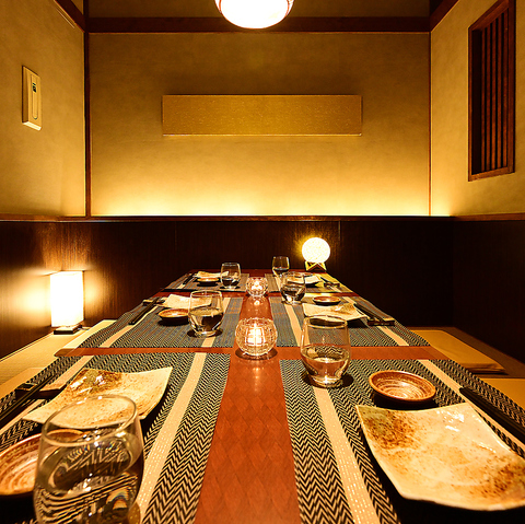 【完全個室完備】 間接照明灯る広々とゆったりできる空間。木を基調とした温もりある店内で楽しく時間を過ごせます。お履き物を脱いでご利用頂ける掘りごたつタイプと背を付けてお過ごしいただけるソファータイプのご用意がございます。お席のご相談も承らせていただきます。