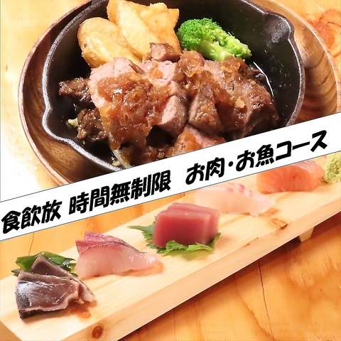 博多名物海鮮、肉料理、串、おでん、その他通常メニュー、お酒も全て食べ飲み時間無制限!
