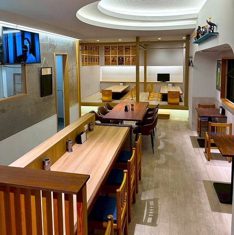 最大18名まで利用できる掘りごたつ席をご用意。1席につき最大9名まで着席でき、宴会や仲間内の飲み会まで幅広いシーンに対応可能です。席の間仕切りは上げ下げができる仕様のため、開放感あるレイアウトからプライベート感を高めた半個室スタイルまで自由に調整できます。利用人数や目的に合わせて最適な空間でお食事をお楽しみいただけます。