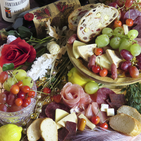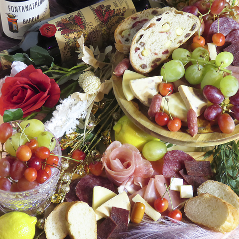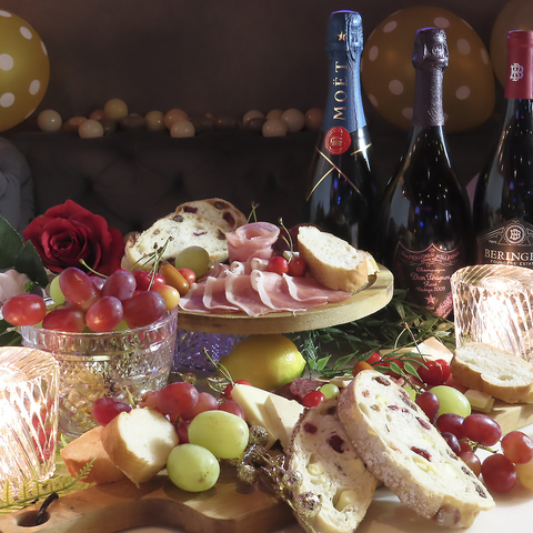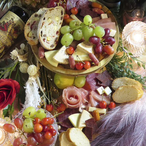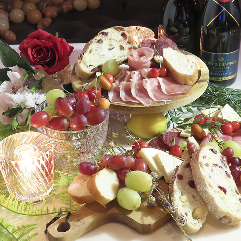 おしゃれなおつまみ。生ハムやチーズ、旬のフルーツや彩り野菜などテーブルを華やかに彩ります。お写真はイメージになり内容はその日その時の“お楽しみ”。季節ごとの食材やテーマに合わせて毎回変わるから、来るたびに新しい発見が…