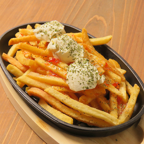 カリカリに揚げられた細めのポテトにチーズをトッピング♪あつあつのポテトを鉄板でご提供いたします!あつあつのポテトを最後までお楽しみください!