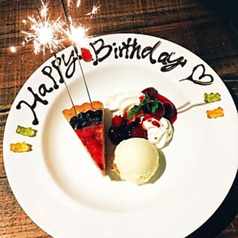 お誕生日や記念日のお祝いにおすすめ!ご友人やご家族、恋人などあなたの大切な方の記念日をお祝いするデザートの盛合せプレートです!お好きなメッセージをデコレーションいたします。スパーク花火を添えて華やかにテーブルまでご提供いたします☆