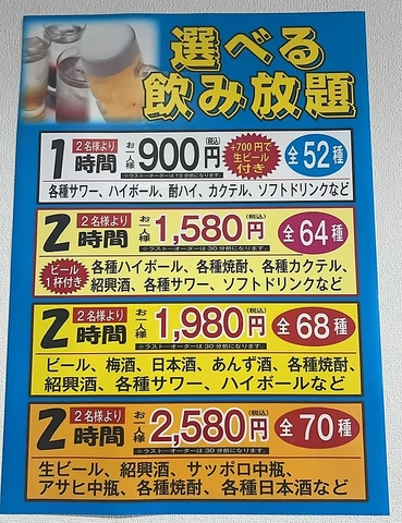 選べる飲み放題は、【全52種】1時間《+700円で生ビール付き》お一人様900円、【全64種】2時間お一人様1580円、【全68種】2時間お一人様1980円、【全70種】2時間お一人様2580円の全4種類がございます!是非ご利用ください◎