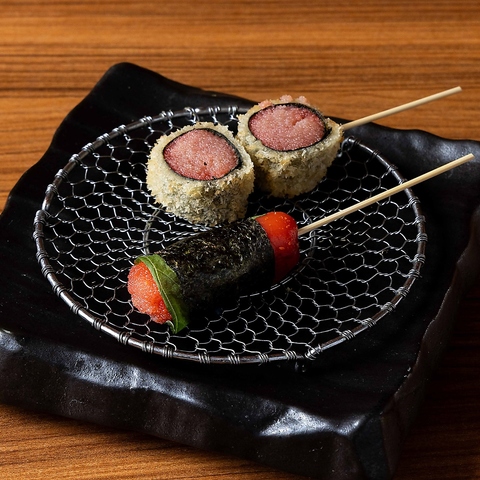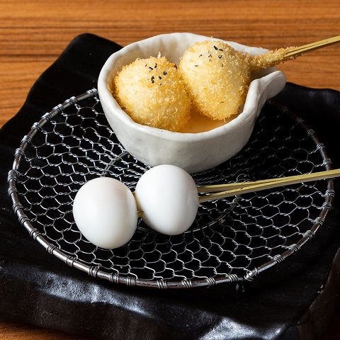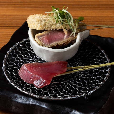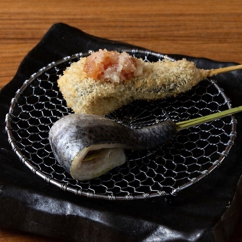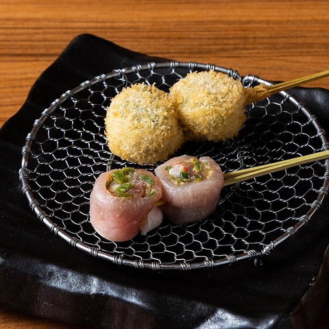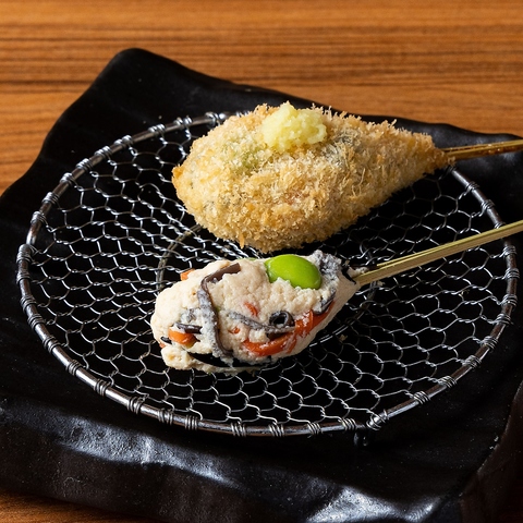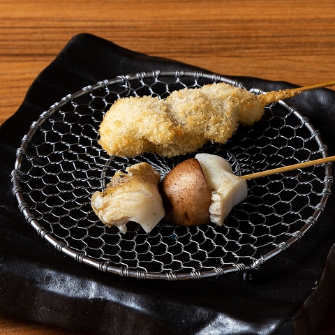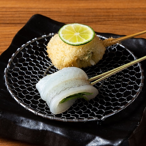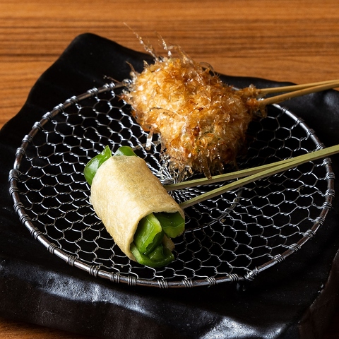 その日、その季節で最も美味しくお召し上がり頂くよう、「おまかせ」スタイルを中心におもてなしいたします。豊富に取り揃えた四季折々の彩りある旬の食材を、それぞれの持ち味に合わせ調理しております。生パン粉にこだわることでカラッと仕上がり、100%植物油・薄い衣でヘルシーな串揚げはサクサクでじゅわっと広がる当店自慢の串揚げです。