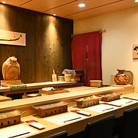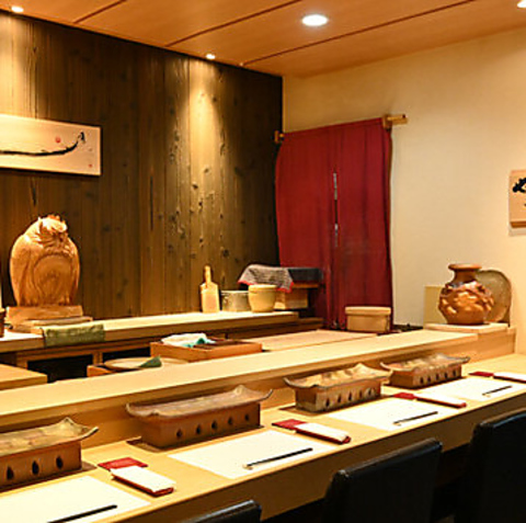檜の一枚板を贅沢に使用しており、木の香りが心地よく漂う落ち着いた空間を演出しています。職人の手仕事を間近で楽しめるカウンター席は、料理を待ちながら会話を楽しむのに最適な場所です。職人との距離が近いため、料理の説明やこだわりを直接聞くことができ、より深い食体験を提供します。