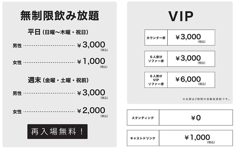 | 料金備考 | 時間無制限飲み放題 男性3000円/女性1000円(週末2000円)+席料有 |