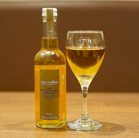 ワイン用ブドウで造られたプレミアムジュース「アラン・ミリア」。シャルドネ種を使った白グレープジュース。