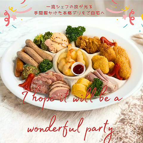 ホテル仕込みの技が光る、贅沢な3名様分のアソートです。唐揚げ、特製肉料理、だし巻きなど、多彩なデリが詰まった大満足の内容。リストは一例、常に最高の食材でお作りします。