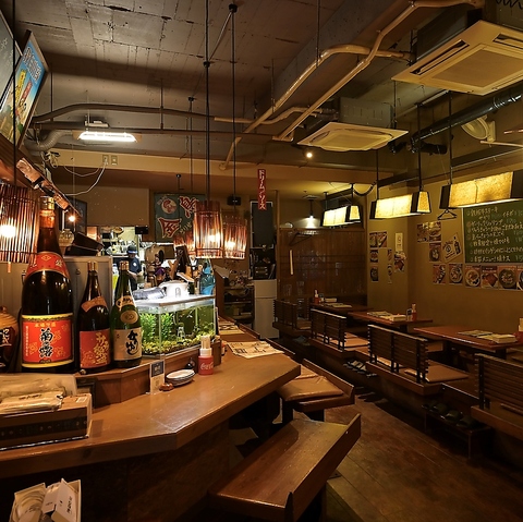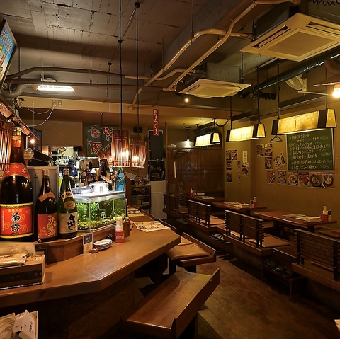 沖縄のレトロな雰囲気が漂う店内で、居心地の良いひとときをお過ごしいただけます♪木を基調とした温かみのある空間には、カウンター席をご用意◎お一人様から友人との飲み会まで、様々なシーンでご利用いただけます。