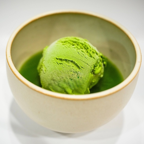 宇治田原町の百年老舗「大正園」の上質な抹茶を使用し、茶道の作法で一杯ずつ丁寧に点てました。立ちのぼる香り高い抹茶の湯気に、ひんやりとした抹茶アイスをそっとのせて、熱と冷、甘みと渋みが織りなす絶妙なハーモニー。まるで翠の茶畑に初雪が舞い降りたかのような一品です。