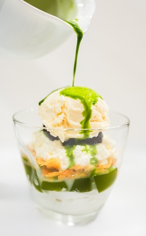 厳選された宇治抹茶、ミルクムース、抹茶ゼリー、つぶあん、生クリーム、香ばしいコーンフレークを丁寧に重ね、豊かで繊細な味わいを生み出しました。アイスクリームは抹茶またはバニラからお選びいただき、仕上げにお客様ご自身で点てた抹茶または香り高いコーヒーをかけていただきます。金箔をふんわりとあしらいました