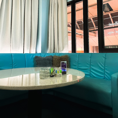 【完全個室/カラオケあり】VIP1(最大10名様まで)明るい水色のソファーが特徴のカラオケ付きの個室になります。シーシャ、フード、お酒、カラオケが楽しめます!