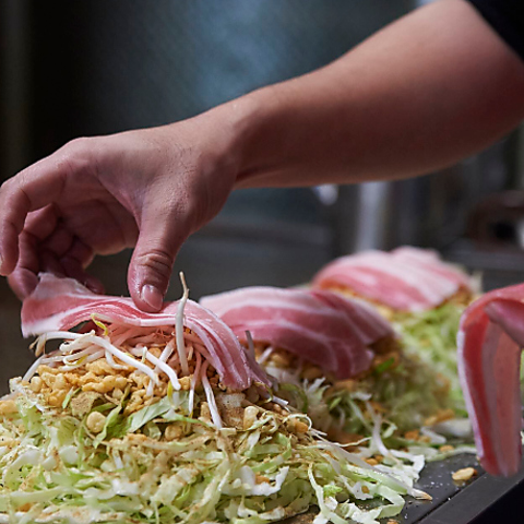 手間を惜しまず丁寧に一枚ずつ心を込めてお好み焼きを焼き上げています。変わらない手仕事の積み重ねこそが、心に残る美味しさを生み出すと信じています。お客様には、目の前の熱々の鉄板で焼き上がっていく様子を間近で楽しんでいただくことも、美味しさの一部です。香りまでご馳走になるライブ感あふれる空間で、職人の技をご堪能ください。