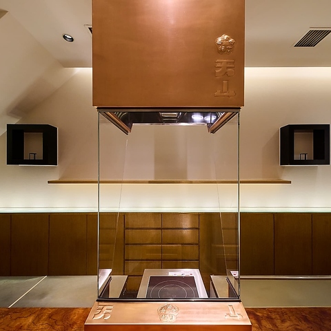 カウンターに腰をかけると、正面には「天山」と記された文様が目に入ります。その意匠が、空間にさりげない品格と静けさを添え、特別なひとときへと誘います。