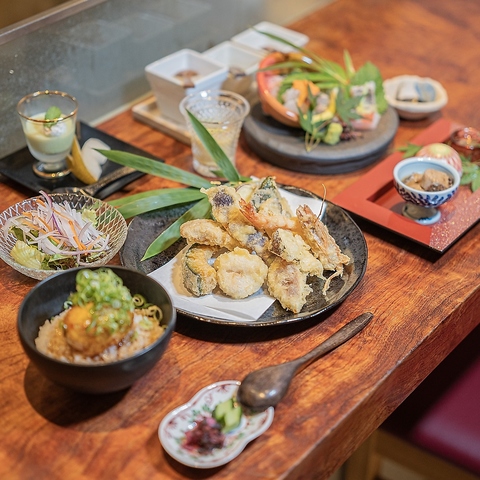 旬の素材を生かした前菜3種に、新鮮なお造り3種盛り。海老や季節野菜など、趣向を凝らした天ぷら10種を贅沢に。お凌ぎの一品を挟み、締めは玉子天ご飯、または+550円で鯛ご飯をご用意。和の余韻を楽しむ、上品なデザート2種とともに。