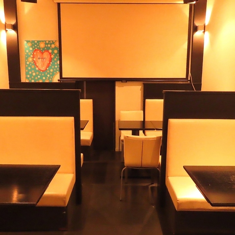 奥のボックス席は全席ソファー席!広々としたテーブルでゆっくり会話をお愉しみいただけます。100インチのプロジェクターも装備し、スポーツ観戦やパーティーでの利用までお客様の自由に使っていただけます◎通常お席ごとに仕切りがついていますが、宴会時は外すことも可能です!