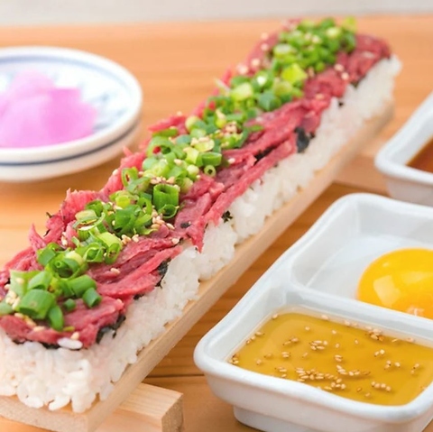 特製超ロングユッケ寿司はボリューム満点でSNS映え間違いなし!お肉好きにはたまらない一品!お酒との相性も抜群!おつまみにもご飯にもお食事にもお勧め!