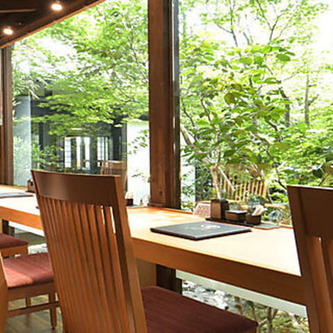 自然に囲まれた特別な時間を楽しめます。一人でもカップルでも、ゆったりとした時間を過ごすことができます。正面に広がる美しいお庭を眺めながら、お食事を楽しむ贅沢なひとときが待っています。大きな窓から差し込む光が、心地よい空間を演出し、リラックスした食事が可能です。