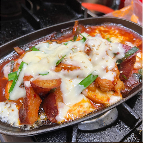 甘辛ダレで炒めたジューシーなチキンと野菜を、とろ~り濃厚チーズに豪快に絡めて頬ばる至福のチーズタッカルビ。旨辛×濃厚の最強コンビが食欲を刺激し、一度食べたら止まらないやみつき系メニュー。SNS映えも抜群で、シェアすれば盛り上がること間違いなし!アツアツのうちにどうぞ!
