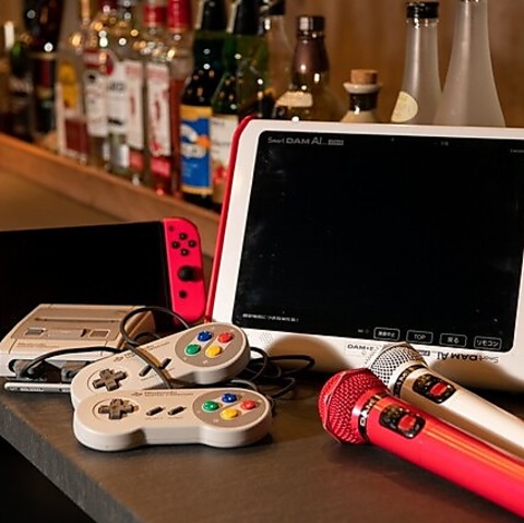 遊び心あふれるアミューズメントバー。バーカウンターでお酒を楽しみながら、カラオケやゲームで盛り上がれます。LIVE DAM Ai搭載で本格カラオケが歌い放題、懐かしのスーパーファミコンや最新のNintendo Switchも無料でプレイ可能。さらに、マイク片手に歌ったりゲームを楽しんだりと、シーンに合わせた過ごし方ができるのも魅力。