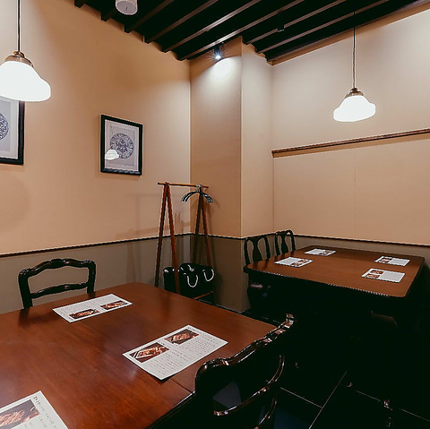最大16名様まで対応可能な連結個室は、大人数での宴席やフォーマルな集まりに最適です。広々とした空間ながらも、イギリスのアンティーク調で統一された落ち着いた雰囲気。事前にご相談いただければ、お客様の用途に合わせた最適な空間をご提供いたします。