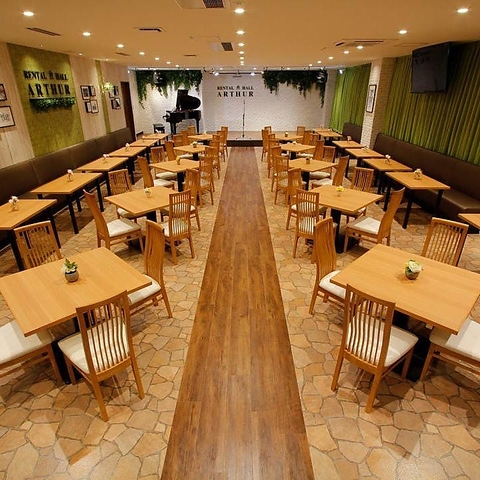 明るく清潔感溢れる店内に、木製のテーブルとイスが並び、緑が壁を彩るナチュラルな雰囲気♪スタンドマイクやプロジェクター&スクリーン、DVDプレイヤー、スピーカーなど、充実の音響設備はもちろん、グランドピアノやカラオケ機器といった有料オプションもございます。
