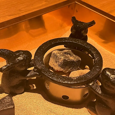 全席の目の前にある囲炉裏。炭入れを支えているのは実はウサギ!SNS映えするので女性ウケもバッチリです。