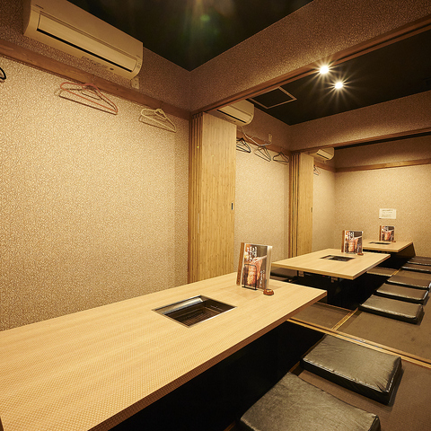 【落ち着いた雰囲気の個室】最大7名様までご利用いただける個室が3室あり、プライベートな空間で特別な時間をお過ごしいただけます!飲み放題付きコースも充実しており、埋め込み式のロースターを完備しており、煙が上がりにくいので快適にお楽しみいただけます。衣類ににおいがつきにくく安心して焼肉を楽しめる環境です!