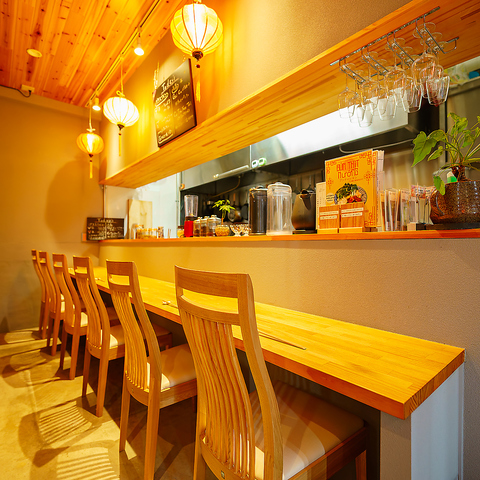 店主との距離が近く、あたたかな空気が流れるカウンター席は全5席。ひとりでふらっと立ち寄って、ベトナム料理と静かな時間を楽しむのにぴったりです。香り立つスープの湯気、手際よく仕上がる料理の音、現地の音楽とともに五感で味わえる特等席。おひとり様やカップル、小さな会話を楽しみたい方にもおすすめです。