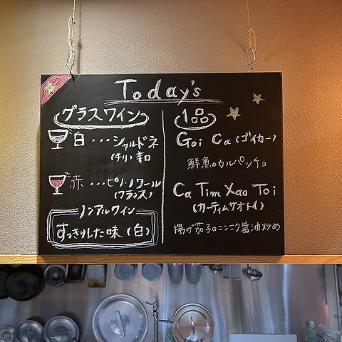 カウンターの上には、店主がその日の気分や仕入れに合わせて選ぶ「本日のおすすめ」を書いた黒板があります。季節の食材を使った一品や、通常メニューにはない特別なベトナム料理が登場することも。黒板を眺めながら、今日だけの味に出会えるワクワク感をお楽しみください。