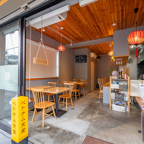 こぢんまりとした店内には、木の温もりを感じるカウンターとテーブル席が並び、シンプルながら落ち着きのある空間が広がります。壁には黒板メニューやさりげない装飾が施され、植物や雑貨がアクセントに。静かなベトナム音楽が流れ、まるで現地の小さな食堂に迷い込んだような心地よさ。