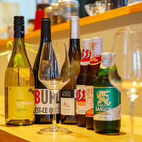夜のベトナム食堂では、料理との相性を考えてセレクトされたワインもご用意しています。スパイスやハーブが香る料理に寄り添う、やわらかな白や軽やかな赤が中心。あえてベトナム料理にワインを合わせる楽しさを知ってほしいという店主の想いが詰まったラインナップです。食事の時間をゆったりと豊かにしてくれます。