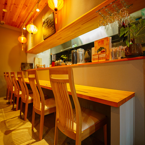 店主との距離が近く、あたたかな空気が流れるカウンター席は全5席。ひとりでふらっと立ち寄って、ベトナム料理と静かな時間を楽しむのにぴったりです。香り立つスープの湯気、手際よく仕上がる料理の音、現地の音楽とともに五感で味わえる特等席。おひとり様やカップル、小さな会話を楽しみたい方にもおすすめです。
