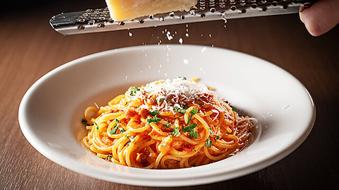 当店の「アマトリチャーナ」は、こだわり抜いた乾麺で味わう絶品の一皿!旨味たっぷりのパンチェッタと甘み豊かな淡路玉ねぎが溶け合うチリトマトソースは、一口食べたら止まらないおいしさ。仕上げに24ヶ月熟成のパルミジャーノチーズをたっぷりかければ、香りもコクも格別です。