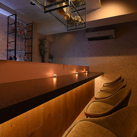 5席を設けたカウンター席では、目の前にずらりと並ぶ様々なお酒のボトルが、まるで秘密の隠れ家のような雰囲気を醸し出します。暗めの照明とネオン看板の光が、さらにその空間を魅力的に演出。お一人様はもちろん、スタッフとの会話を楽しみながら、大人の時間をお過ごしいただけます♪