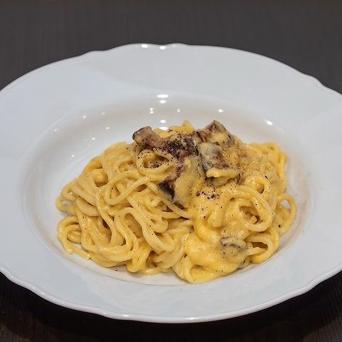 生クリームは使っていません/ベーコンでなく、自家製グアンチャーレ(トントロの塩漬け)を使用/2種類のチーズ(パルミジャーノ・レッジャーノとペコリーノロマーニ)と卵黄のソースを絡めて、粗くすり潰したベトナム産黒胡椒をトッピングしました※仕入れ状況や仕込み状況により提供できない場合もあります