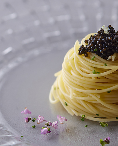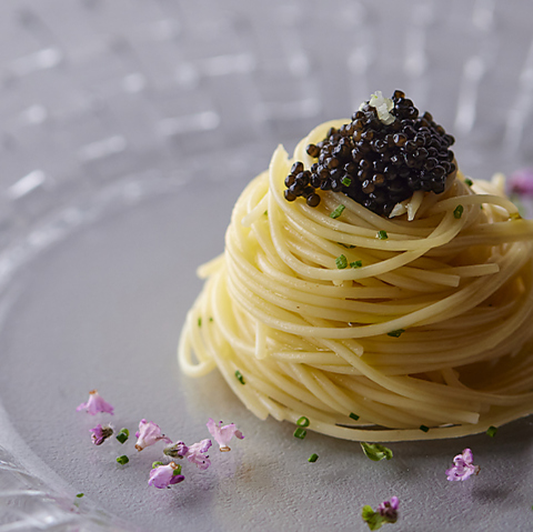 シェフが贈る、至高のスペシャリテ「キャビアの冷製フェデリーニ」をお楽しみください!口の中でとろけるキャビアの濃厚な旨味と、ひんやりとしたフェデリーニの絶妙なハーモニーが、五感を刺激します。目にも美しい一皿は、まさに美食の芸術品。各コースに追加でご注文いただけます。