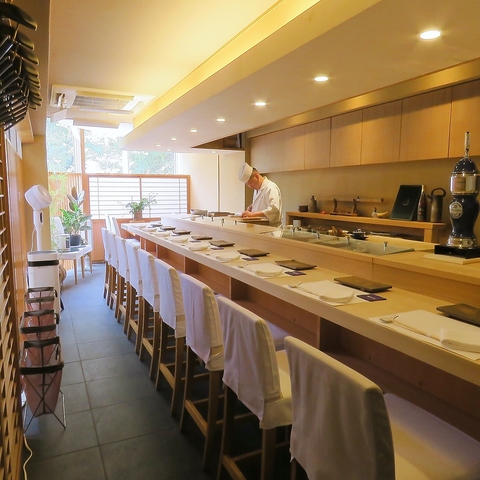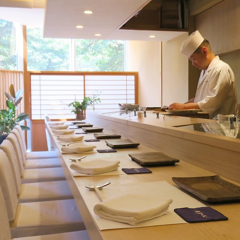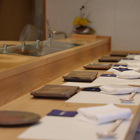 約1,000年前の木曽檜を使った一枚板のカウンターは圧巻です。大将の繊細な手仕事を間近でご覧いただける特等席で、温かい雰囲気の中お寛ぎください。気兼ねなくお寛ぎいただける、温かくも洗練された雰囲気でお迎えいたします。
