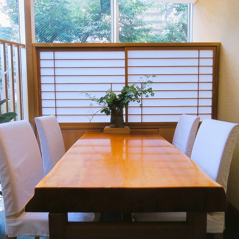 4名様掛けのテーブル席からは、窓越しに目黒川の並木道を望むことができます。日中は柔らかな自然光が差し込み、開放感に満ちた心地よい空間です。特に春には美しい桜並木を眺めながら、旬の握り寿司をお楽しみいただけます。ご家族やご友人との和やかな集まりに最適です。