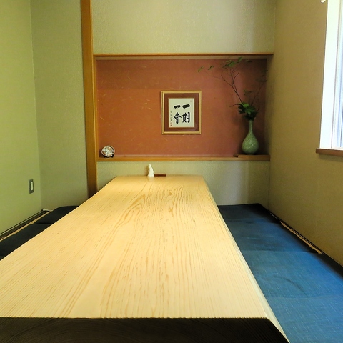 全11席のカウンターは、木曽檜の一枚板を使用しており、温かみのある上質な空間を演出しております。熟練の職人が繰り出す鮮やかな手捌きを目の前でご覧いただける特等席です。お一人様はもちろん、少人数でのご利用にも最適で特別なひとときをお過ごしいただけます。