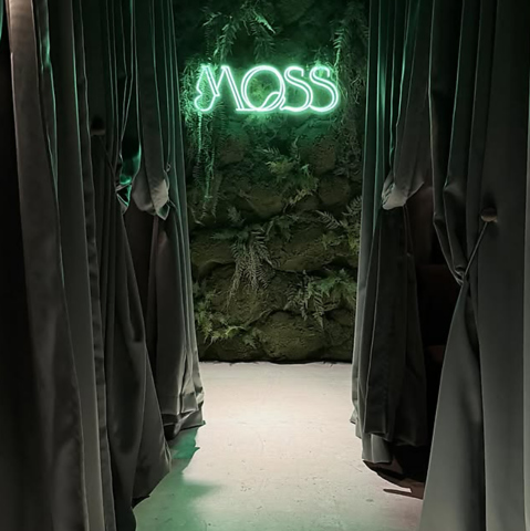 店名であるMOSSは日本語にすると「苔」という意味。入って正面の苔を模したグリーンウォールが皆様をお迎えします。店頭にも大小様々なグリーンを配置し、コンセプトカラーのモスグリーンと相待って落ち着いたくつろげる空間を演出します。
