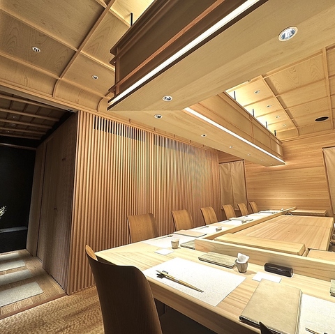 旬の食材をより美味しく、より感動していただけるよう丁寧な仕事を施し最高の逸品として皆様にお届けしております。樹齢500年の吉野檜を使ったカウンターを中心に、木の柔らかい温もりに包まれた空間で味わう食事は格別のもの。食材・器・空間のすべてに想いを込めて握る一貫を、ぜひご堪能ください。