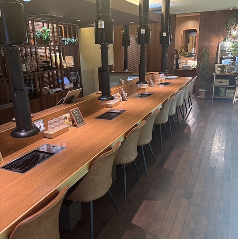 ≪無煙ロースター完備のカウンター席!≫木と緑に囲まれた心地よいカウンター席をご用意。落ち着いた空間で、お一人様でも気兼ねなく、カフェのようにリラックスしてお食事を楽しめます。デートや女子会、普段のお食事にも最適な空間です◎