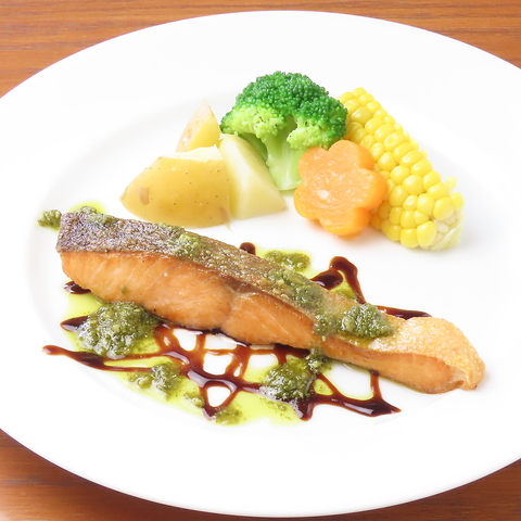 バジルソースとの相性抜群のサーモンのポワレ♪