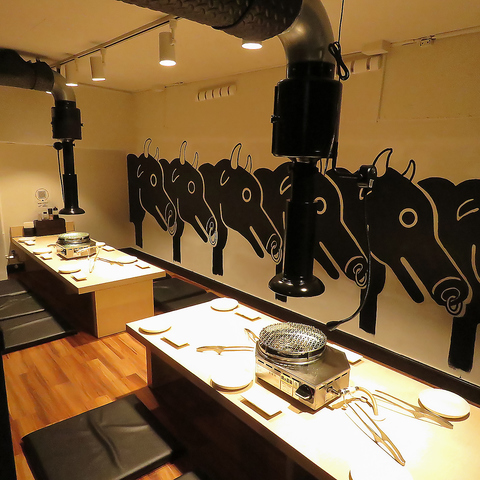 4名用の掘りごたつ席が4卓あり、ゆったりとしたスペースが魅力です。温かみのある照明と落ち着いた雰囲気の中で、友人や家族と楽しいひとときを過ごせます。美味しい焼肉を心ゆくまで楽しみながら、リラックスした時間をお過ごしください。