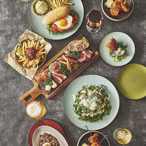 クラフトビールや生ビールが選べる120分飲み放題付プラン。国産黒毛和牛100%粗挽きハンバーグやシャルキュトリー5種盛合せなど、人気料理を贅沢にご堪能いただけます!各種飲み会・宴会や女子会にも◎