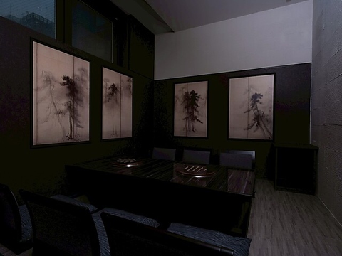 重厚な雰囲気の完全個室は、少人数での会食に最適な空間でございます。水墨画風のアートが飾られ、落ち着いた設えが特別なひとときを演出いたします。6席が1卓完備されており、大切なご接待やプライベートな語らいの場にぜひご利用ください